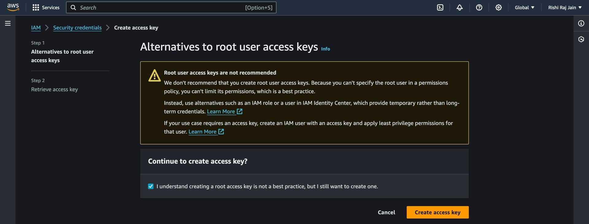 - In the navigation bar in your AWS account, choose your user name, and then choose Security credentials.