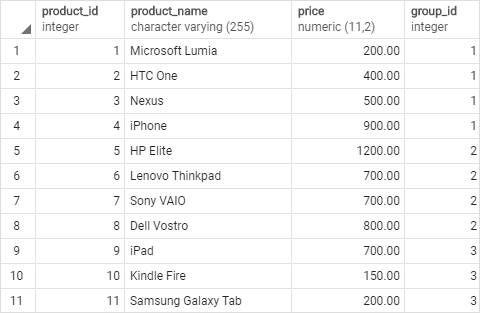 PostgreSQL Window Function - RANK function In the laptop product group, both Dell Vostro and Sony VAIO products have the same price, therefore, they receive the same rank 1. The next row in the group is HP Elite that receives the rank 3 because the rank 2 is skipped.